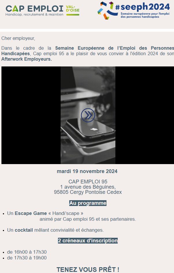 Venez participer à l'afterwork organisé par Cap Emploi 95 à destination des employeurs du Val d'Oise. Afterwork sous le format d'un escape game en collaboration avec nos partenaires sur la compensation du handicap.
